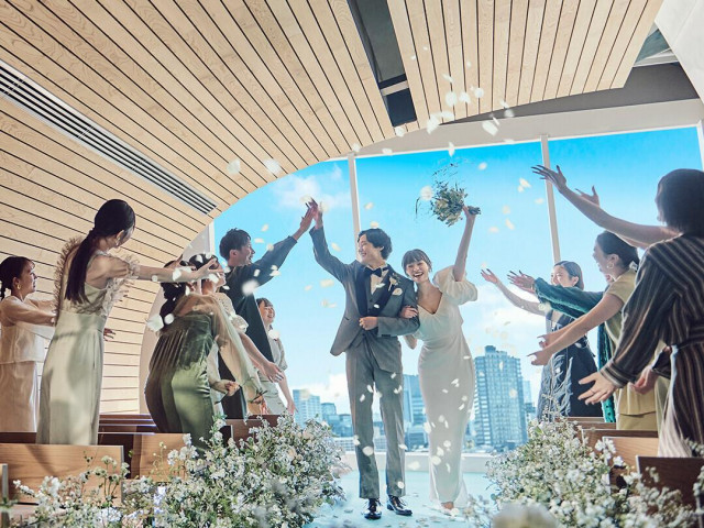 【オリジナル人前式】軽やかなジャズ生演奏・ゲストが奏でるグロウスベル・木製の結婚証明書を使った演出など、大切な人達と一体感を感じる人前式。窓一面に表参道の街並みが広がり、開放感のある空間での感動挙式。