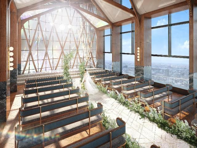 | おすすめ ポイント | 大きな窓から自然光が溢れる壮大なスケールのチャペル「MUSIC HALL」では、街を一望できる美しいビューが広がる。チャペルの横に併設されたテラスは、挙式後のセレモニーや写真撮影も楽しめる贅沢な空間。 |