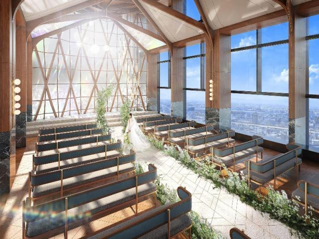 【光・空・緑のチャペルで入場体験】 ホテルでありながら開放感や自然光溢れる、最上階の15階にあるチャペルで入場体験を体感して。自然素材のチャペルは、自由度の高い挙式の形を誓いに合わせて選択できます
