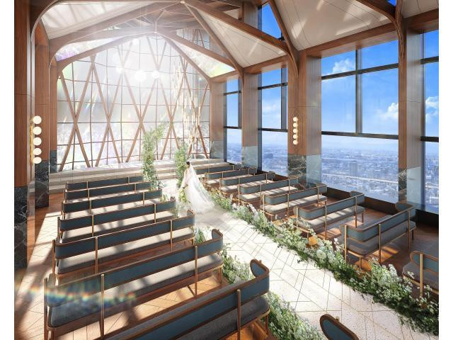 ホテルでありながら開放感や自然光溢れる、最上階の15階にあるチャペルで入場体験を体感して。自然素材のチャペルは、自由度の高い挙式の形を誓いに合わせて選択できます