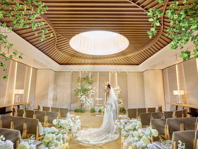 【天からの祝福が降り注ぐチャペル】木の温もりがありつつ、円形の大きな天窓からは、新郎新婦を祝福するかのように太陽の光がたっぷり射し込み、新郎新婦様を祝福!どこか温かみを感じる雰囲気を体験して。