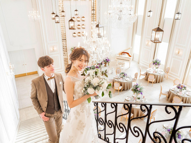 【2階まで吹き抜けで開放感たっぷりの会場】花嫁憧れの階段からの登場シーンにゲストも大盛り上がり♪全天候型の屋内ガーデンでは天候に左右されずウェルカムパーティやデザートブッフェを楽しめる
