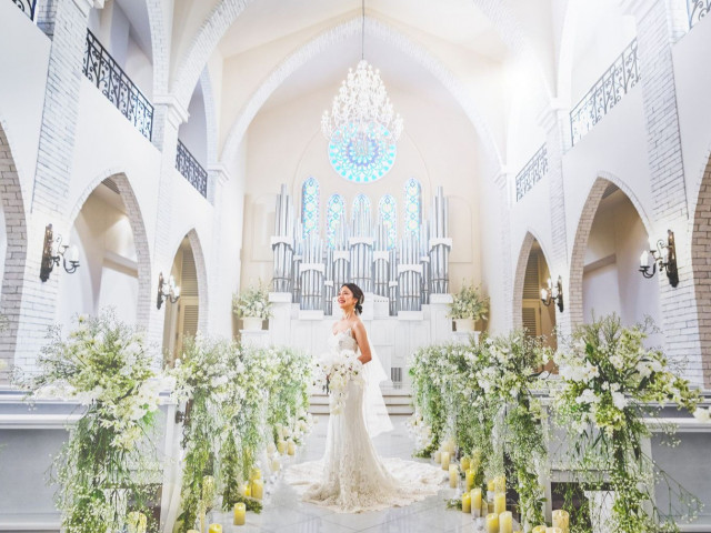 【天高10M、自然光あふれる感動チャペル体験】純白の大理石のバージンロードと美しいブルーのステンドグラスが輝く、高さ10Mの天井に響き渡るパイプオルガンの音色、感動に満ちた入場シーンを体験してみて
