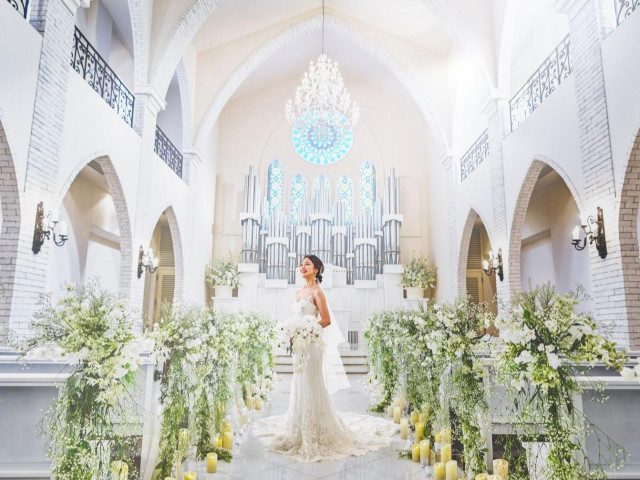 【天高10M、自然光あふれる感動チャペル体験】純白の大理石のバージンロードと美しいブルーのステンドグラスが輝く、高さ10Mの天井に響き渡るパイプオルガンの音色、感動に満ちた入場シーンを体験してみて