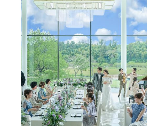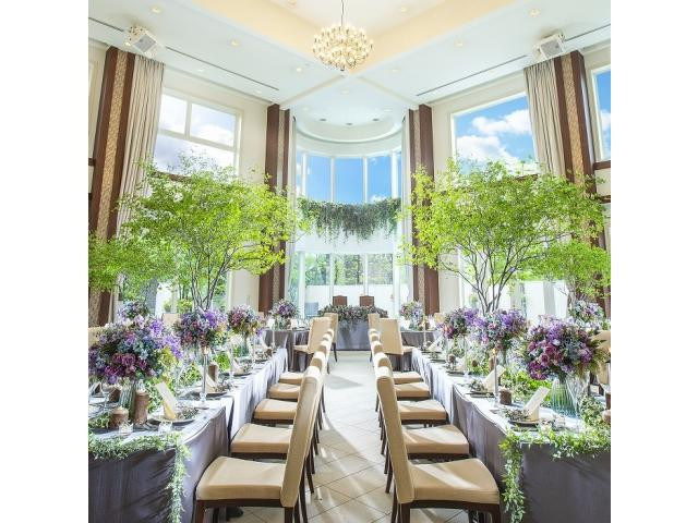 三面のガラス窓から偕楽園の景色を独占するような開放感が魅力の披露宴会場。会場のコーディネートも大人シンプル、和モダン、スタイリッシュ、クラシカル等お二人だけのオリジナルコーディネートが叶う♪