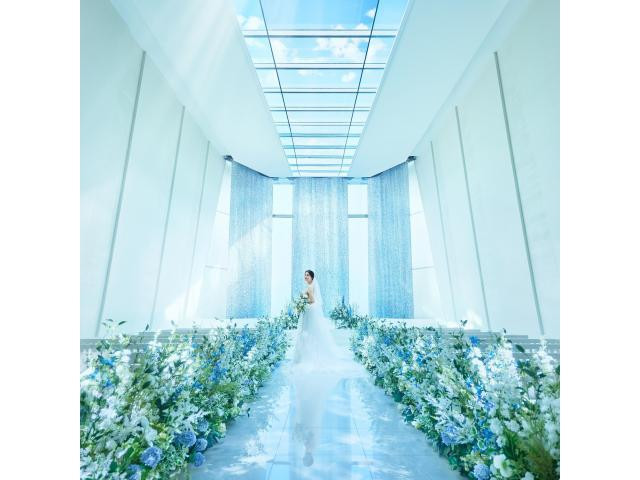 【天窓から自然光が降り注ぐ”光と水のチャペル”】天窓・祭壇の水のきらめきにより、光に包まれた空間に♪全天候型の大階段やフラワーシャワー、チャペルでの映像演出など、ゲストの皆様の記憶にも残る特別な一日を