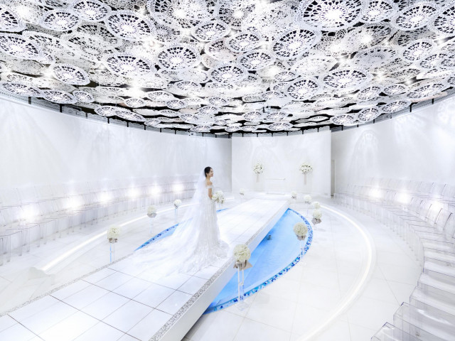 【挙式会場で入場体験】見たこともない演出が叶う白亜のチャペル・緑に包まれ風が通る独立型ガーデンチャペル・神々しい光に守られた端正な新感覚の神殿から選べる挙式会場を体感。館内のチャペルでは映像演出も体験可能。