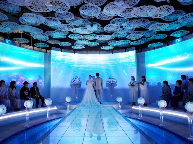 【挙式会場で入場体験】見たこともない演出が叶う白亜のチャペル・緑に包まれ風が通る独立型ガーデンチャペル・神々しい光に守られた端正な新感覚の神殿から選べる挙式会場を体感。館内のチャペルでは映像演出も体験可能。