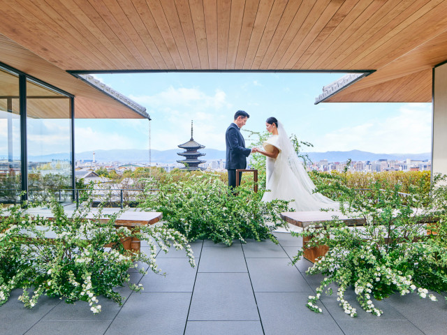 八坂の塔や京都の街並みを望むことのできる、眺望が自慢の「テラス挙式」をご案内いたします。