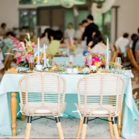 水色×ピンクをテーマにしていたので水色のテーブルクロスを