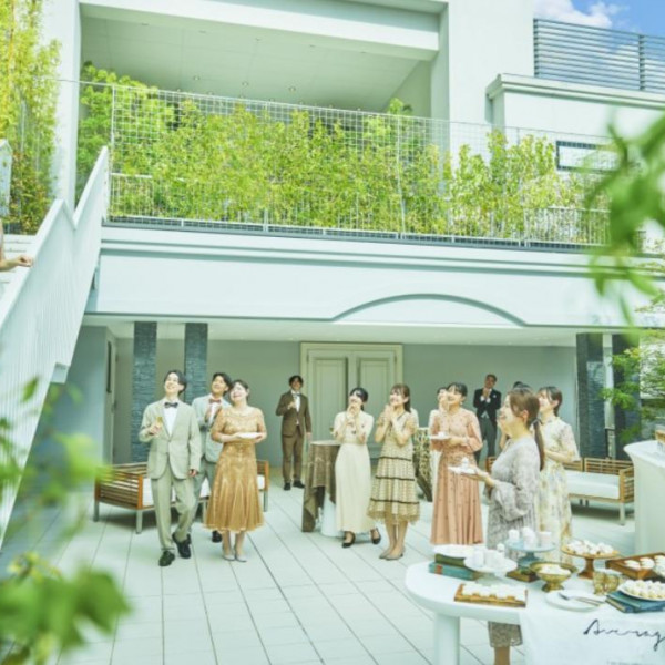 | ガーデン演出 | 有りパーティ会場へ進む手前には、もう一つのガーデンテラスをご用意。 大きなバーカウンターから振舞われるウエルカムフードやドリンクに、 披露宴パーティへの期待が高まるプレパーティのお時間をご提案します。 |