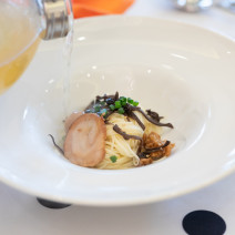 「ラーメン」が大好きなお二人のために、メインのお肉料理の後に自家製ラーメンを提供させていただきました。こだわりは「スープ」。こーひーサイフォンで抽出した一番出汁をゲストの目の前でかけたら完成♪会場中が良い香りに包まれました!