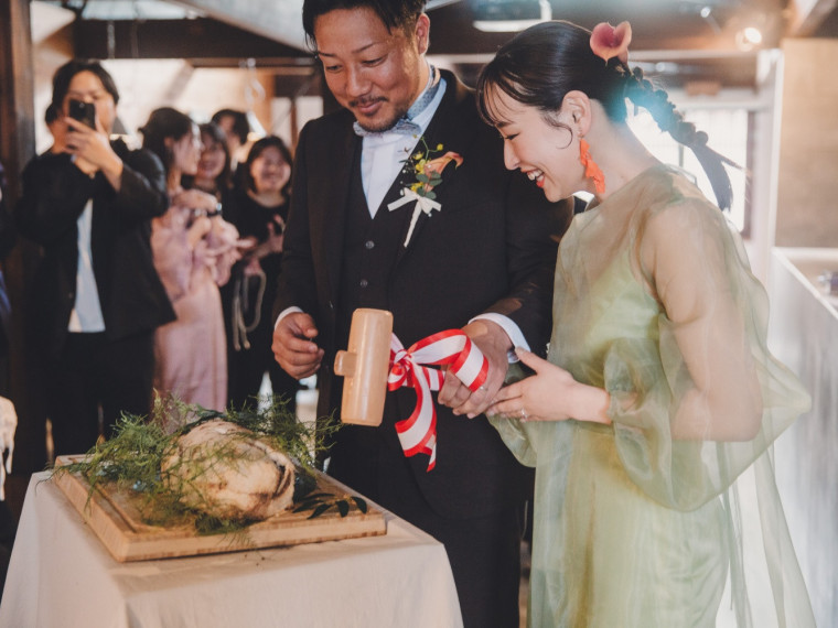 漁師の新郎さんが持ち込みの魚をご自身で捌き皆さんに振る舞った事。その日のウェディングケーキは鯛の塩釜焼きになりました。