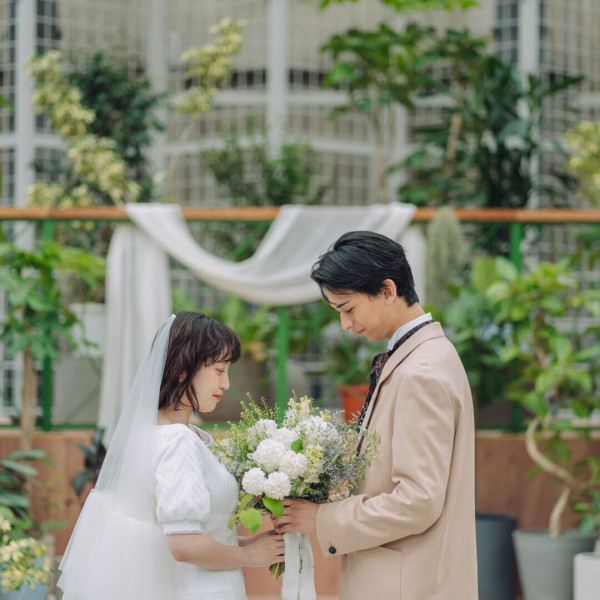 こちらは春の新緑シーズンにおすすめのフォトタイム充実プラン!前撮りスポットとしても人気の久屋大通庭園フラリエ。庭園に広がる色とりどりの木々やお花に囲まれてしっかりとお写真が残せます。