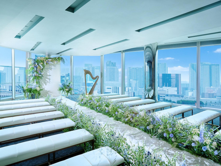 | おすすめ ポイント | 全面の窓から自然光が溢れる開放感のある『スカイチャペル』。夜には、東京の夜景をバックにライトで浮かび上がるクロスが印象的。80名まで収容のホワイトベンチ。弦楽三重奏や聖歌隊が彩りを演出します。 |