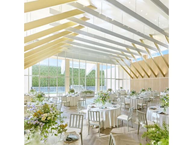 【天井高9.6Mから自然光が降り注ぐ全天候型チャペル】最大120名様着席可能!圧巻のスケールを誇るチャペルは好立地とは思えない、空だけが見える特別な空間そのもの。ゲストの皆様の記憶に残る特別な瞬間を♪