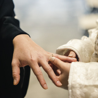 自然光がたっぷり差し込むぬくもりあふれるチャペルは、肩肘張らないあたたかな空間。バージンロードには人生を振り返るメッセージや感謝の言葉が刻まれ、リース型の装花はふたりとゲストの「縁」を表しており、ゲストと近い距離で笑顔あふれる挙式が叶う。