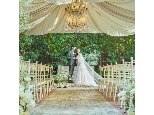 選べる2つの挙式スタイルをフェアで体験。緑と光に包まれた全天候ガーデンチャペル。またはシャンデリア煌めく館内チャペルで感動の挙式。挙式後は青空広がるガーデンでフラワーシャワーの祝福を。
