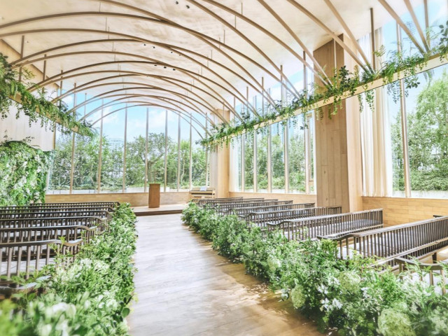 【都心とは思えない開放感ある空間を見学】青空を望み、自然光が降り注ぐシンプルな空間でセレモニーを迎える。アーチ型天井からは木漏れ日が降り注ぎ、大切なゲストに見守られて心温まる挙式が叶う。