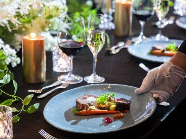 天井高6mを誇る開放的でスタイリッシュな「HINOKI」クリストフル社のカトラリー、リーデル社のグラス、お洒落なバーなど拘り抜いたコーディネートをゲスト目線でチェック。※日により設営が異なります。