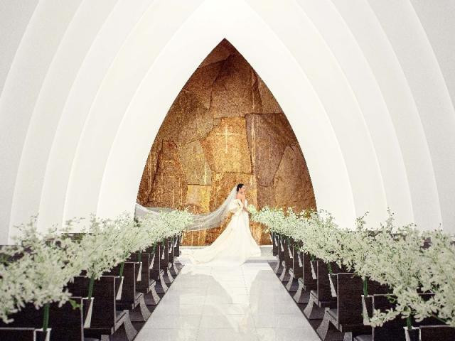 光、水、石、木でつくられた「母なる自然」がテーマのチャペル。扉を開けた瞬間オリジナルアロマの香りが漂い、水のせせらぎとハープやオルガンの生演奏が響き渡る。素直な気持ちで誓える場所をぜひご体感ください。