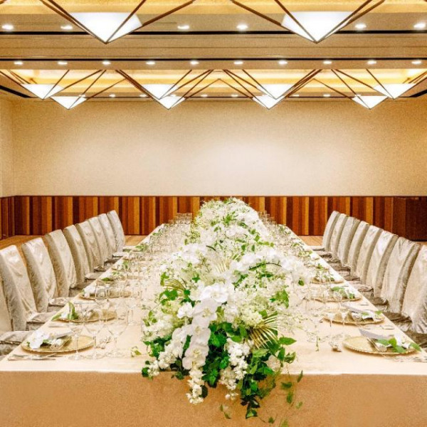 【60名様以上でHINOKIをご利用いただけます】天井高6m を誇る開放的な空間のメインバンケット「HINOKI」中人数〜大人数のパーティに最適で、華やかな一日を優美に彩ります。