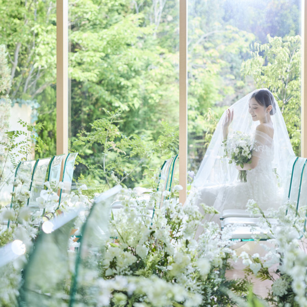 セントフォレストチャーチ 広いガーデンの一角に佇む、青々とした緑に囲まれたスタイリッシュな独立型教会。 両サイドが全面ガラス張りの開放的な空間は、 まるで森の中にいるよう。
