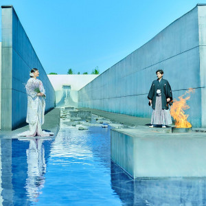 親族だけでなくご友人にも参列していただける神前式が叶う、伝統的ながらも洗練された「山の神殿」。たくさんのゲストに見守られながら執り行われた挙式後は、神殿に正対して造られた長さ50mもある「火と水の庭園」で折鶴シャワーやフラワーシャワーなど、ゲストの祝福を受けながらアフターセレモニーを。