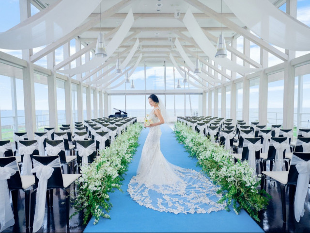 【花嫁を美しく輝かせる絶景チャペル】全面ガラス張りで海へと続くバージンロードが輝く唯一無二のチャペル。帆をイメージした天井装飾の下、木造船をモチーフにしたチャペルでおふたりの新たな船出を祝福します!