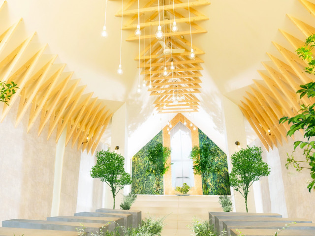 温かな雰囲気で自然光が降り注ぐ白を基調としたチャペルは、まるでリゾート地に佇む小さな教会のよう。