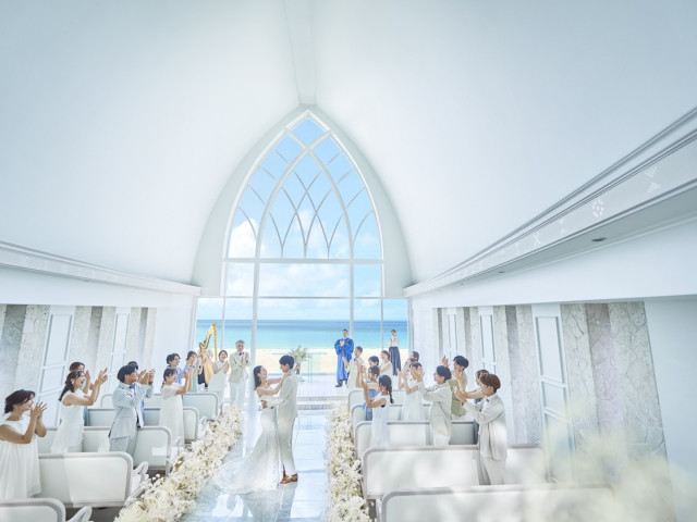 【扉を開いた瞬間感動!】海・空・緑が望める光が差し込む白亜のチャペルでは想い出に残る感動の挙式が叶います。結婚式の動画やお写真で当日の臨場感も体感いただけます。