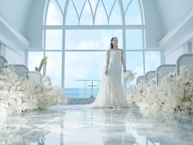 【扉を開いた瞬間感動!】海・空・緑が望める光が差し込む白亜のチャペルでは想い出に残る感動の挙式が叶います。大切な方と歩くバージンロード。ぜひ感動の入場体験を!