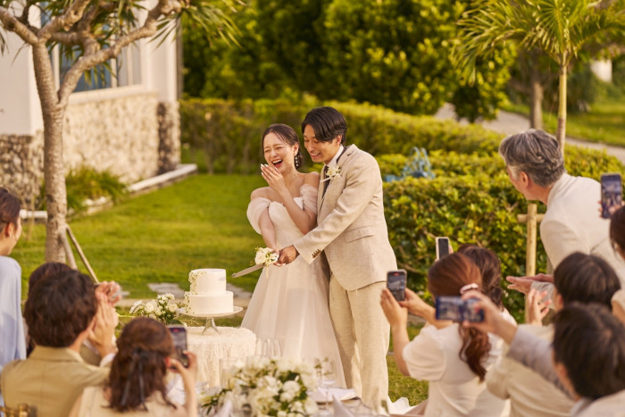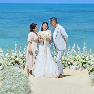 白を基調としたチャペルで、扉が開いた瞬間に広がる青空と美しい海の景色には、とても感動しました。挙式ではハープの音色が美しく響き渡り、歌ってくださった方の歌声も素晴らしく、ゲストからも大変好評でした。海が見える披露宴会場は、1階だと水平線と目線の高さが重なり、美しい景色を間近に感じることができました。ケーキ入刀は外のスペースで行うことができ、気持ちよかったです。少人数での結婚式だったため、会場の広さも十分に感じられ、ゆったりと過ごすことができました。式場まではタクシーでの送迎を手配しました。近くにはお菓子御殿がありますが、周囲はとても静かで落ち着いた雰囲気だったため、気になることはありませんでした。白を基調とした、海が見えるチャペルからの景色は本当に素晴らしく、心に残る美しさでした。当日は飛行機の到着がやや遅れた影響で、ホテルのチェックインも遅くなり、リハーサルメイクの時間が押してしまいました。そのため、リハーサルメイクの予約は、余裕を持ったスケジュールで組まれることをおすすめいたします。詳細を見る (450文字)
