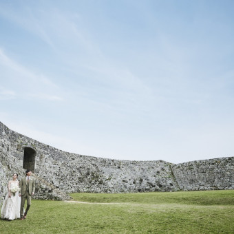 石造りの城壁と広がる空が印象的なロケーションで壮大でドラマチックなウェディングフォトを。