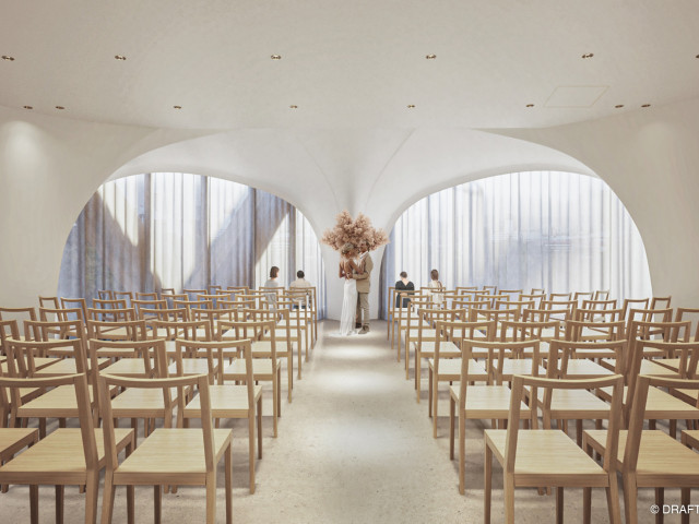 横浜の海を一望する公園でのガーデン挙式と自然光と風が包む屋内挙式・選べる2種類の挙式について図面や完成パースと共にオンラインでご紹介。厳かでもなく、カジュアルでもなく、安心してお祝いできる。そこにいるすべての人が心地よいと感じる建築のこだわりについてご説明いたします。