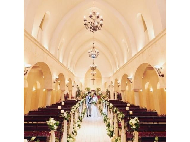 【天井高16m&全長11mのバージンロードを誇る、本格大聖堂で演出体験】全天候型だから、天候・時間にも左右されず、美しいドレス姿が叶う空間に!花嫁に人気のライティング演出など、フェアで体験しよう♪