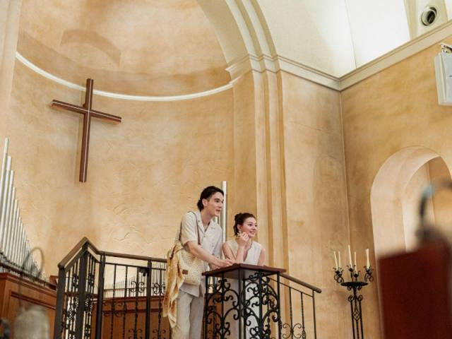 天井高16mや11mのバージンロードなど圧倒的な大きさを誇る大聖堂を体験。南仏の教会を忠実に再現するため、現地より輸入した赤土や黄色土を用いた壁、荘厳なステンドグラスが真の深みと重厚感を与える空間