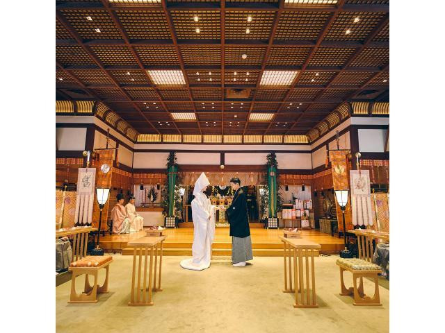 【神前式創始の神社】◆伊勢神宮の御祭神である天照皇大神と豊受大神を奉斎◆神職、巫女、楽人たち総勢13人が心を込めてご奉仕する神前結婚式◆拝殿内は最大80名までご参列が可能です