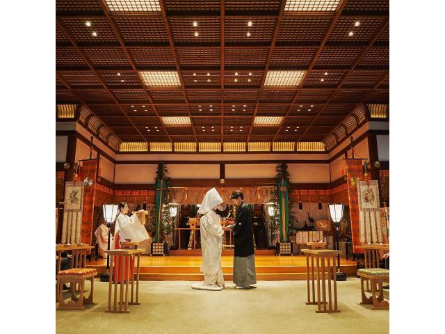 【神前式創始の神社】◆伊勢神宮の御祭神である天照皇大神と豊受大神を奉斎◆神職、巫女、楽人たち総勢13人が心を込めてご奉仕する神前結婚式◆拝殿内は最大80名までご参列が可能です