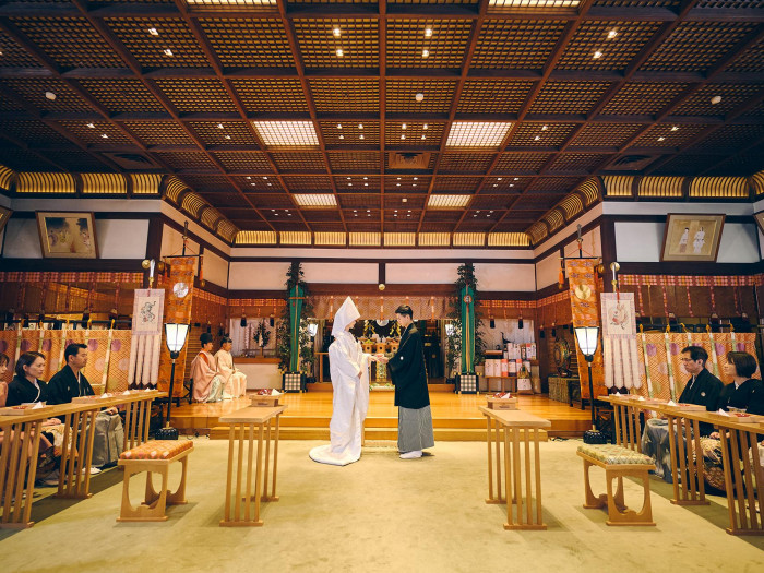 神職・巫女・楽人が奉仕する神前結婚式は、日本古来の伝統を色濃く受け継いだ格式高い儀式です。雅楽の音色や巫女の舞、三々九度など、ひとつひとつの所作に意味が込められており、ゲストにとっても心に残る体験となります。