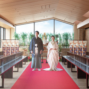 宗教色のないセレモニー空間だからこそ、京都の自然に包まれながら和装での人前式が叶う