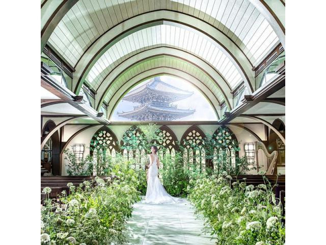 おすすめ ポイント | 五重の塔を臨む窓から差し込む自然光でステンンドグラスが輝く幻想的な空間 バージンロードの長さは12m、天井高は7m |