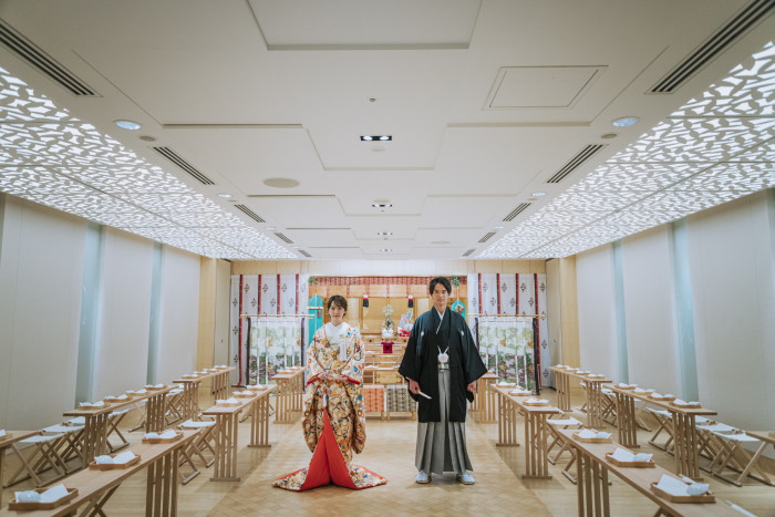 神前式に求められる厳粛さとモダンデザインが融合した、結の空間。雅楽の生演奏に包まれて、誓詞を読み上げる時、深い感動と夫婦の絆の重さを感じます。