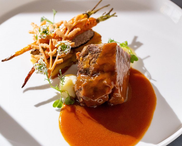 リフォーリアNAGOYAのスペシャリテ「牛頬肉のビール煮込み」は本場イタリアのミシュラン2つ星レストランで経験を積んだ料理長が、イタリアから持ち帰ったレシピを日本人好みの味付けにアレンジ。