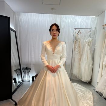 全体の雰囲気はシンプルですが、裾にボリュームがありさみしくならないデザインです。マーメイドですが身体のラインも響きにくい生地で、運動不足の私の体でも綺麗に見えました。ハートカットが女性らしさをより出してくれます。 1枚目:前 2枚目:うしろ