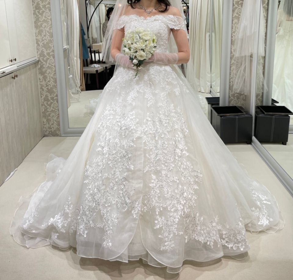 衣装を見たときに、ふわふわで可愛い!と思って試着をお願いしました。プリンセスラインかな?と思ったらAラインだそうです。私は、背が高いので1cmヒールを履いた状態の写真です。腕のチュールが二の腕をカバーしてくれる女の子らしい可愛いドレスです。チュールのドレスを探している方にはぜひオススメしたいです。 1枚目:フロント 2枚目:バック