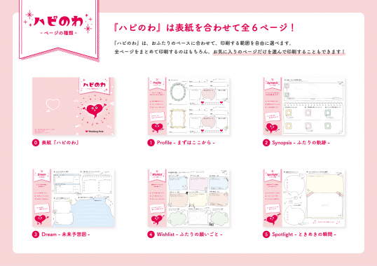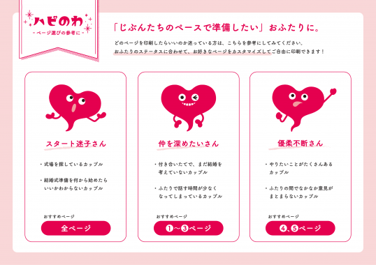 『ハピのわ』はどのページからでも書き始められますが、迷ったときには、おふたりのステータスに合わせてオススメしたいページがあります。ぜひ、お好きなページから書き始めてみてください。