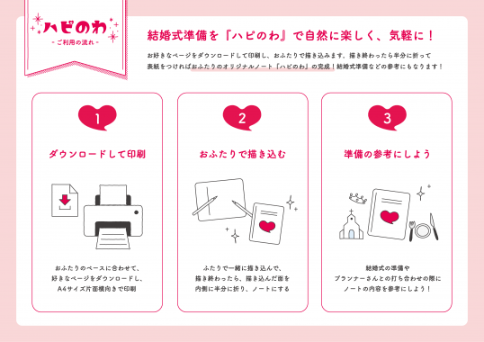 ふたりの想いを描き込み、ふたりだけの『ハピのわ』を作ってみませんか?下記のボタンからデータをダウンロードし、A4サイズ片面横向きで印刷してください。