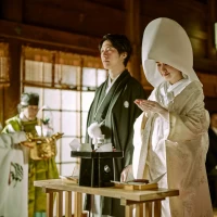 神前式は、日本の伝統と厳粛な神道の儀式が織り成す、格式高く深遠な結婚式です。神様へふたりの結婚を報告する儀式は、先祖を敬う心や家族の絆を再認識する機会となり、白無垢や色打掛などの美しい衣裳が更にその雰囲気を高めます。神殿内への入場、雅楽に合わせた巫女舞など、神前式ならではのシーンはゲストにとっても印象深い体験になることでしょう。